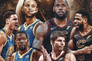 2018年总决赛宣传海报中,勇士是杜库汤,骑士则是詹姆斯、TT和科沃尔。