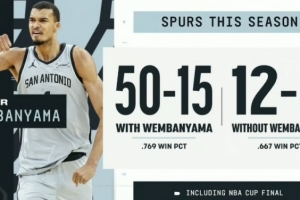 文班亚马出战马刺战绩50胜15负,胜率76.9%。