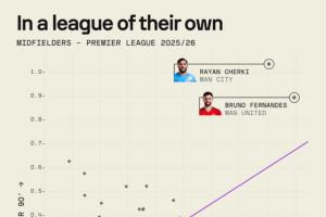 体育资讯04月23日讯 sofascore统计了每90分钟创造的机会和进球/助攻比,谢尔基和B费断档领先,没有其他中场球员更接近。
