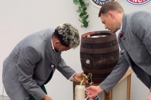 德国啤酒节之际,拜仁官方社媒晒出诺伊尔、迪亚斯从桶中接啤酒的视频,配文:“为德国啤酒节干杯!”