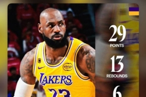 本场比赛,詹姆斯出战45分钟,投篮22中10,三分9中4,罚球6中5,拿到29分13篮板6助攻3抢断,还有8个失误。