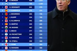 英超历史主帅得分榜: