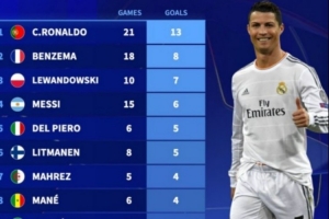 体育资讯4月28日讯 本赛季欧冠半决赛开赛在即,德转盘点了自92年改制以来欧冠半决赛进球榜,具体如下:
