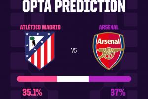 Opta超算预测,阿森纳首回合获胜概率37%,高于主场作战的马竞(获胜概率35.1%),平局概率27.9%。