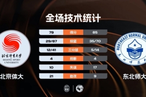 末节比赛,东北师大的进攻表现没有丝毫好转,可以说是更加糟糕,他们在前七分钟的时间里只拿到6分,北京体大一波流直接完成反超,比赛悬念打到了最后,关键时刻王玖豪命中领先三分球,祖力布哈尔强投三分不中让北京体大彻底失去机会,最终东北师大85-79险胜北京体大。